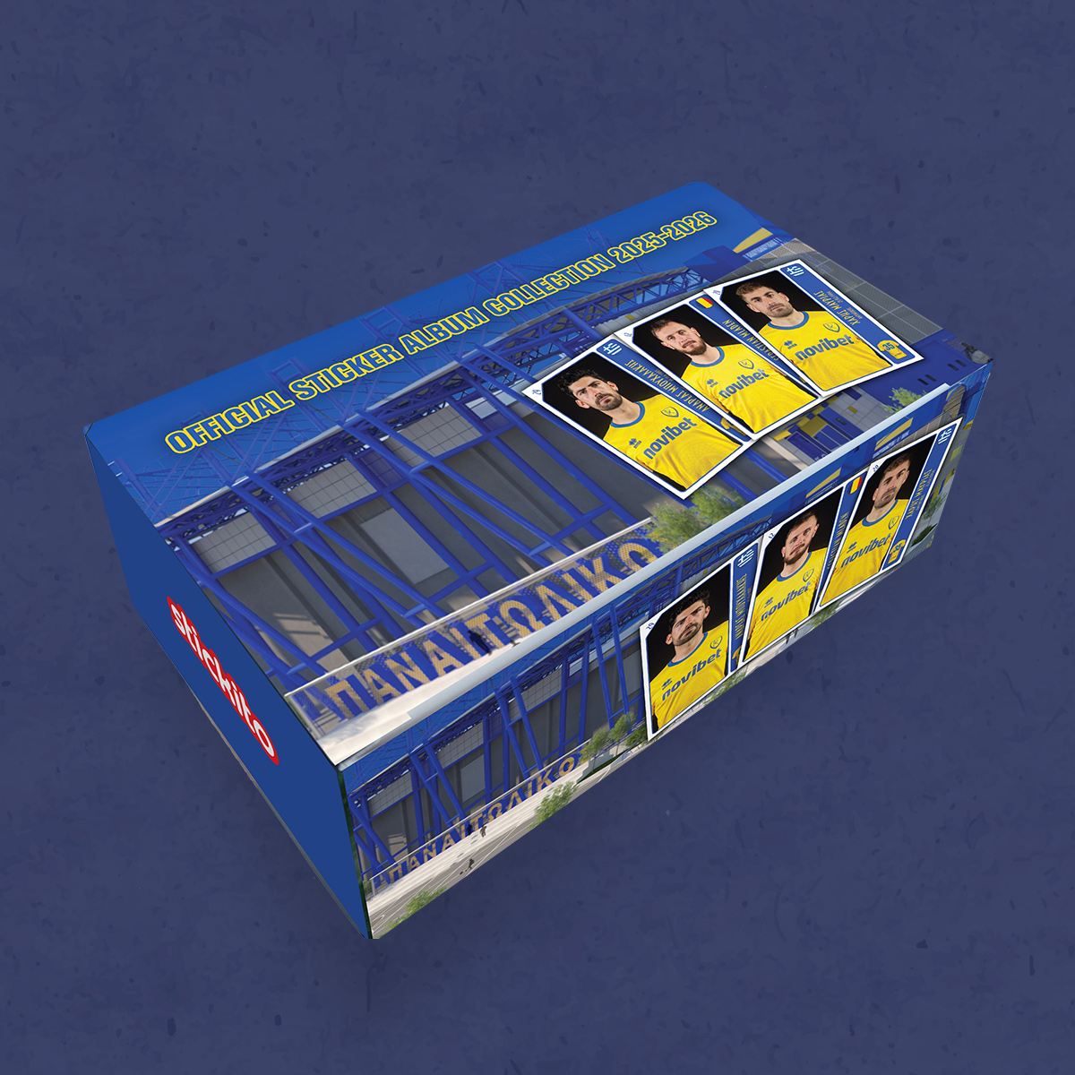 Official Panetolikos 2025–2026 sticker collection display box, celebrating the club’s historic 100-year anniversary, containing 25 sticker packs, with 5 stickers per pack. Featuring the First Team, Women’s Team, youth squads, and coaching staff — a must-have collectible for true fans and collectors.